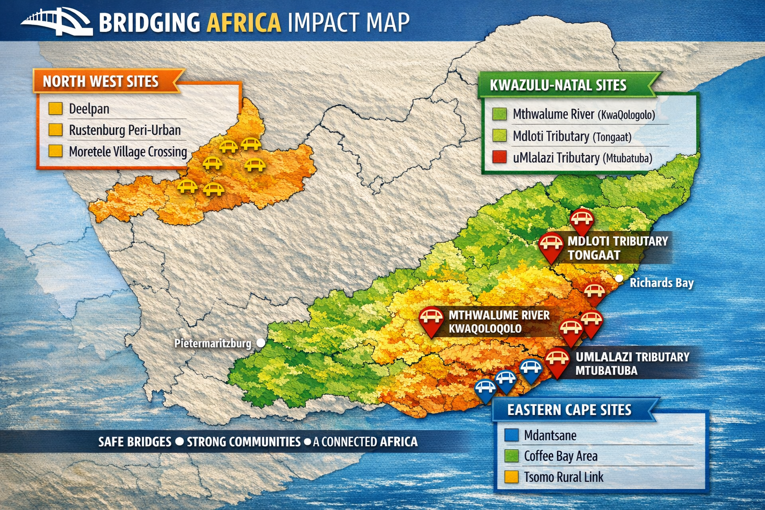 Bridging Africa serves rural and peri‑urban communities across South Africa who face daily danger or isolation due to unsafe river crossings.
